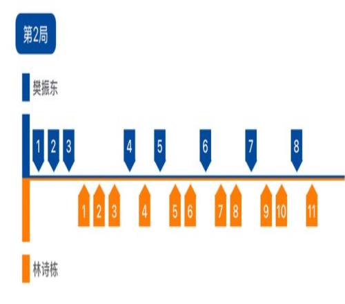 第二局较量,樊振东3比0开局,林诗栋不甘示弱连下三分。此后双方比分交替上升,在这一局一些关键球处理上,林诗栋略胜一筹,11比8,双方大比分1比1平。