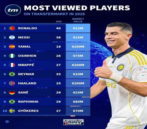北京时间12月26日,德国转会市场统计了2025年度德国转会市场球员浏览量排名,其中C罗居首,梅西第二,亚马尔第三。