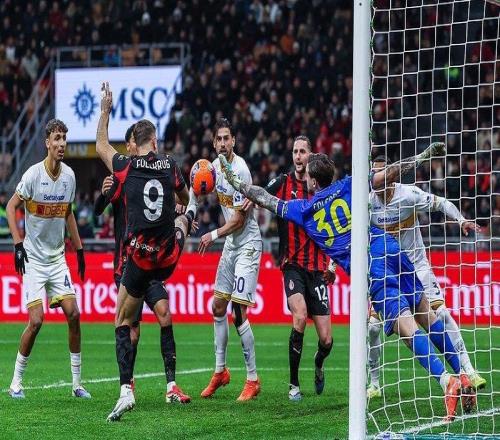 北京时间1月19日,意甲第21轮,AC米兰主场对阵莱切。比赛中。图源:视觉中国上半场,AC米兰得势不得分,半场战罢,双方战成0-0。下半场第76分钟,萨勒马克尔斯右路传中,菲尔克鲁格头球破门